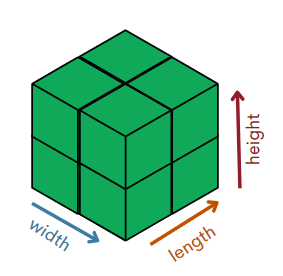 A cube has three equal dimensions: length, width, and height.