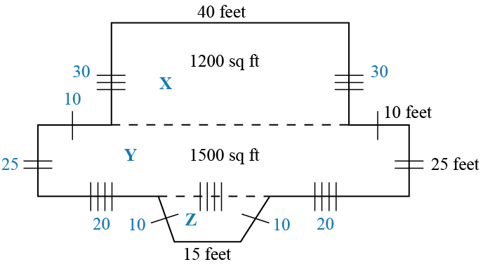 Your student will need to use the given square footage to find some of the missing side lengths. Remind your student that all the same markings mean that those sides have equal length.